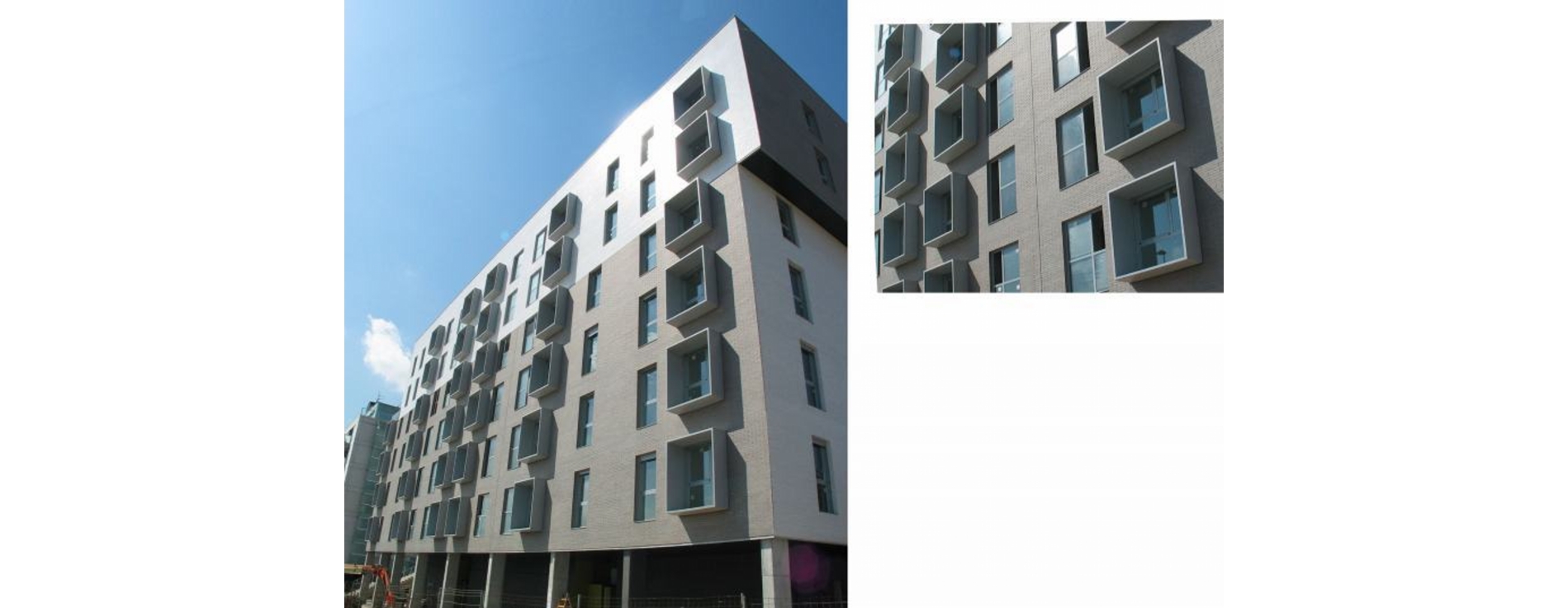 Las 39 viviendas se han organizado entorno al número mínimo de elementos comunes (con el fin de no incrementar la repercusión de estos en las unidades de viviendas) resultando dos portales. En cada uno de ellos, tanto el núcleo de escaleras como el ascensor no tienen significación exterior a nivel volumétrico, de tal forma que permiten completar con continuidad compositiva prevista en el PERI.