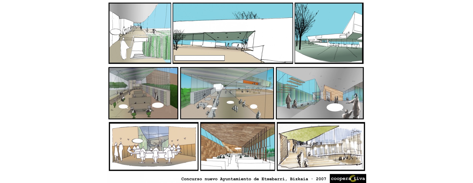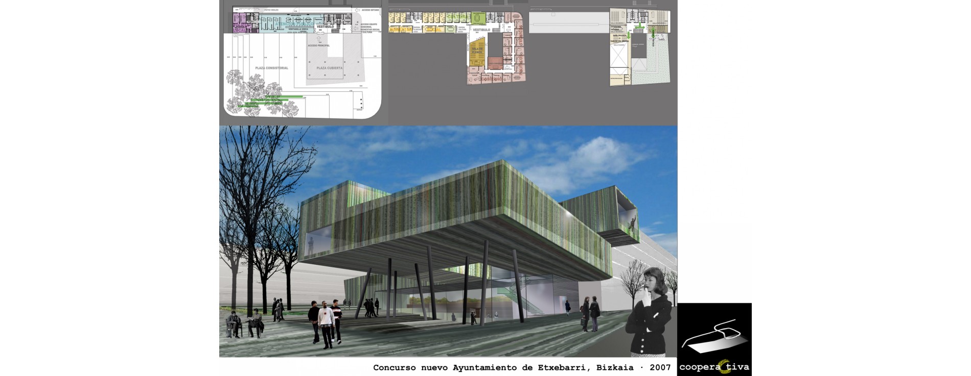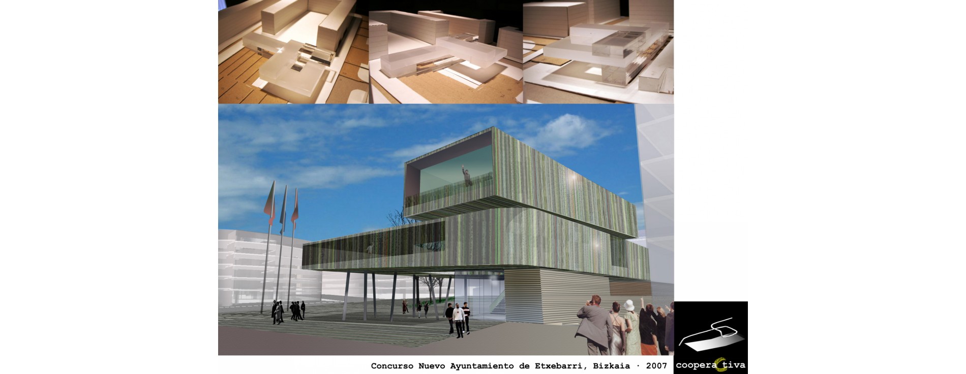 tipo de obra: Edificio Público situación: Etxebarri, Bizkaia promotor: Ayuntamiento de Etxebarri año: 2007 caracteristicas: La edificación se aprovechará de las condiciones urbanas existentes del solar, actuando como un telón de fondo y delimitando el espacio de una nueva plaza. Al enroscárse en si misma sobre el área del solar, genera un vacío cubierto que gravita sobre el área de acceso y delimita un plaza descubierta. La articulación volumétrica del edificio ofrece diversas visiones diferenciadas según su punto de acceso y el tratamiento vítreo de sus fachadas, transformandolo en un objeto singular y abstracto que aporta autonomía y gran identidad. El edificio descubre sus áreas más públicas y accesibles, para generar un nuevo espacio, que como una plaza pública en diversos niveles, permite compartir entre los ciudadanos una amplia representación de sus actividades.