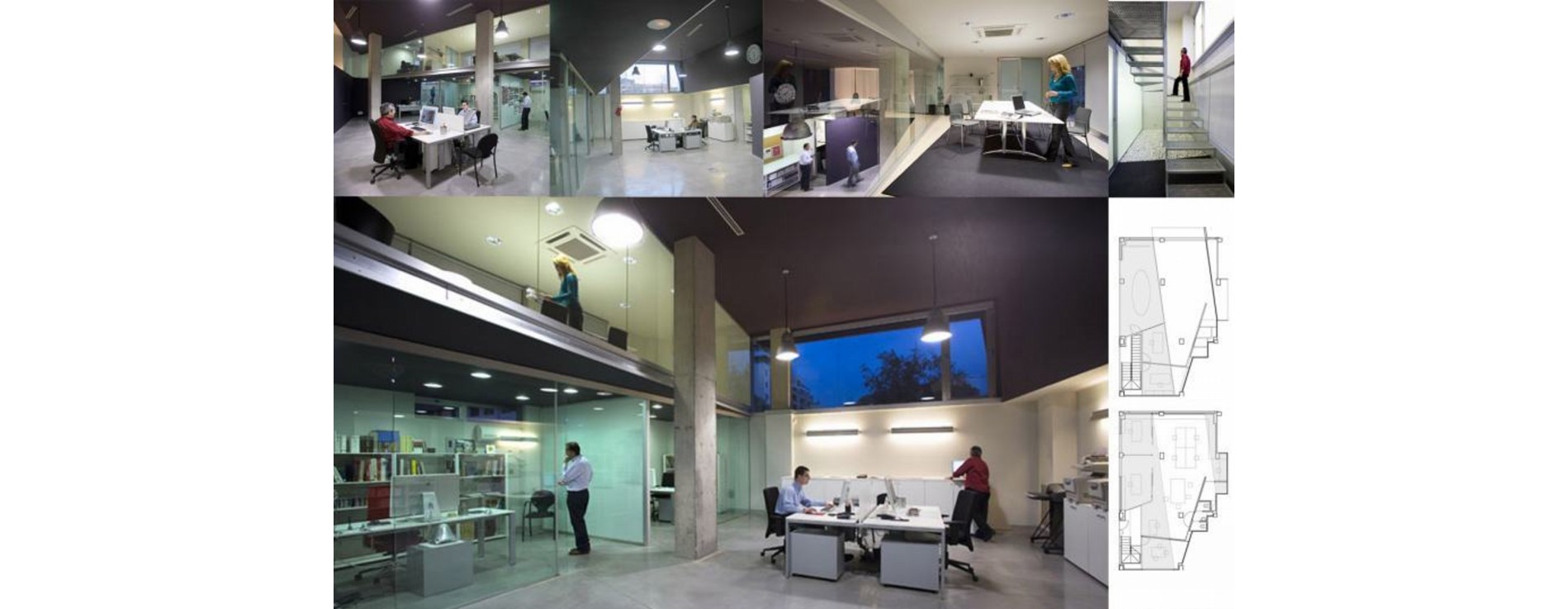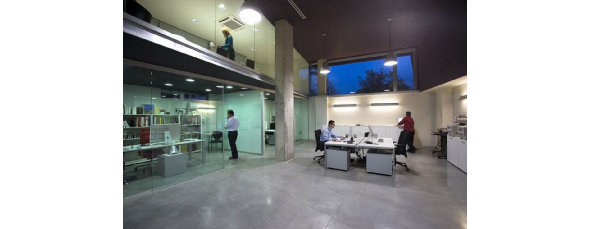 El proyecto localiza la entreplanta con despachos y salas de reunión en el frente de fachada más larga para aprovechar la luz y la posibilidad de ventilación directa de las piezas que en él se sitúan. El espacio central de trabajo queda de esta forma protegido de la luz directa del este y, al mismo tiempo, cualificado a doble altura. Las dependencias de aseos y almacén quedan localizadas en la medianería opuesta, regularizando visualmente la geometría actual de la lonja.