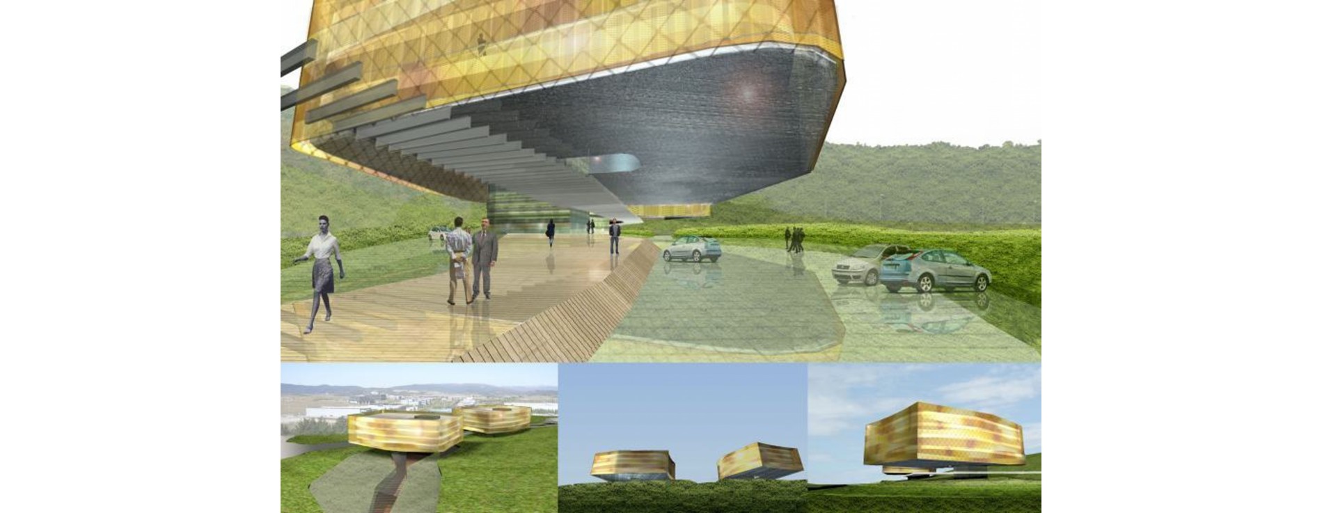 tipo de obra: Concurso edificio terciario situación: Parque Tecnológico de Alava promotor: Parque Tecnológico de Alava año: 2007 caracteristicas: La primera intención es crear algo vitalmente diferente: un contrapunto dinámico al sereno parque tecnológico. Visualmente se convertirá en la nueva identidad, reconocible al instante, contemporáneo y distintiva, enérgico en su singularidad (como las empresas que se alojarán en su interior) El perímetro irregular del solar queda ordenado por una disposición de piezas que devuelven la mirada hacia el parque, aprovechándose de las mejores vistas y orientación, ofreciendo un contrapunto visual al mismo de gran calidad, en el que el entorno es el fondo necesario para su relieve. El conjunto dialoga con el fondo natural de la ladera y al mismo tiempo con las construcciones interiores del polígono. Esta situado en una frontera entre lo construido y lo natural por lo que en él se mezclan ambos mundos. La propuesta, en definitiva, toma ventaja de la posición elevada del solar respecto al resto del polígono, y la enfatiza ya que sus edificaciones buscan elevarse al máximo para garantizar las vistas.