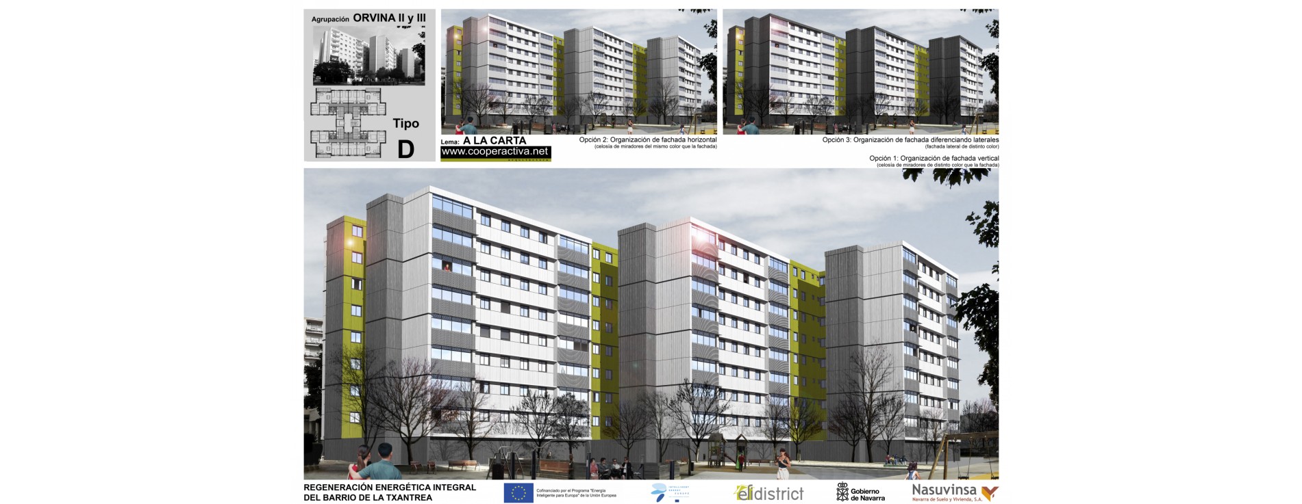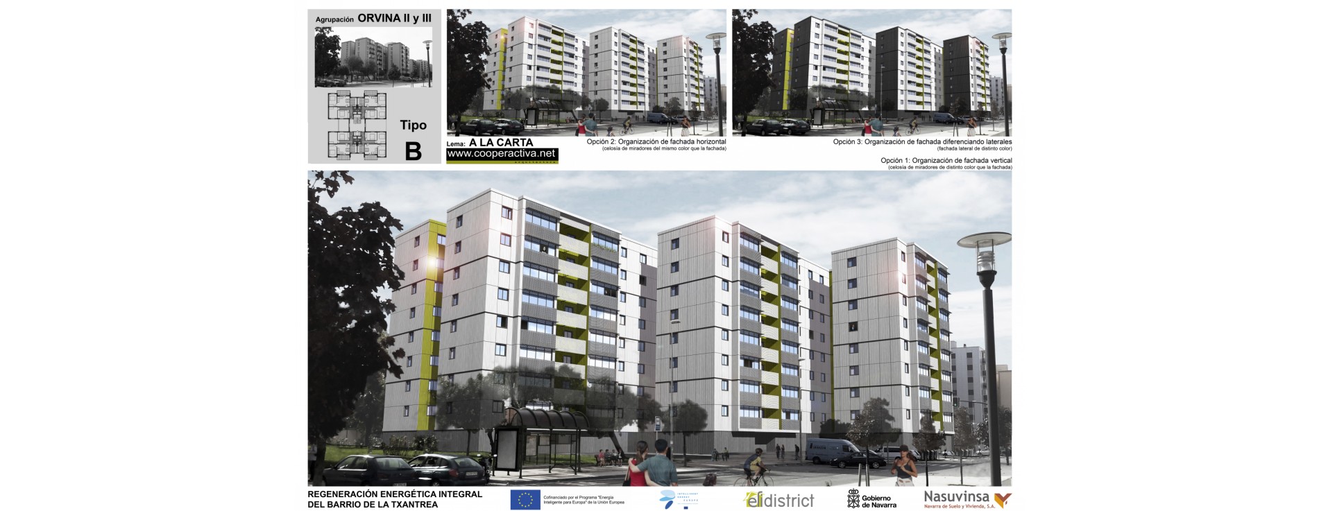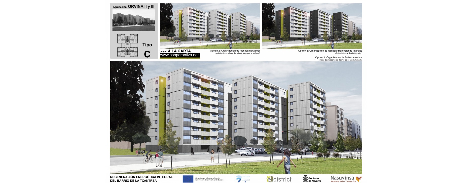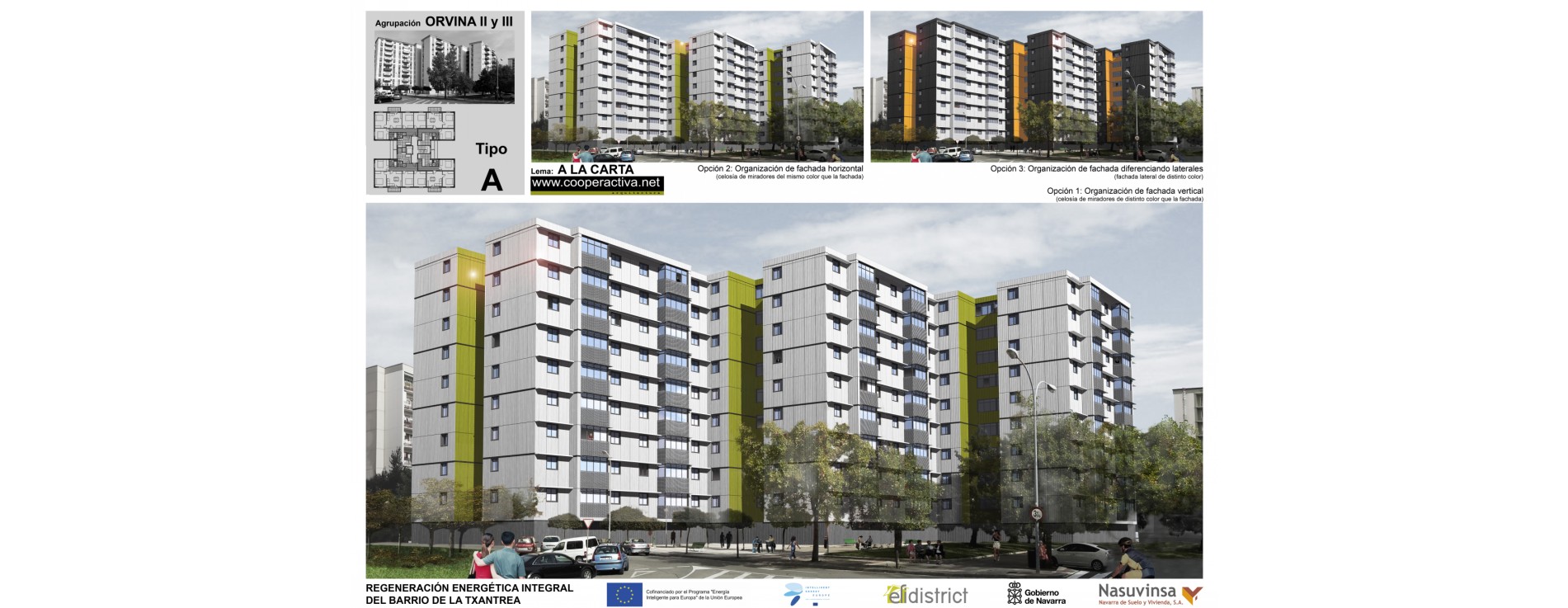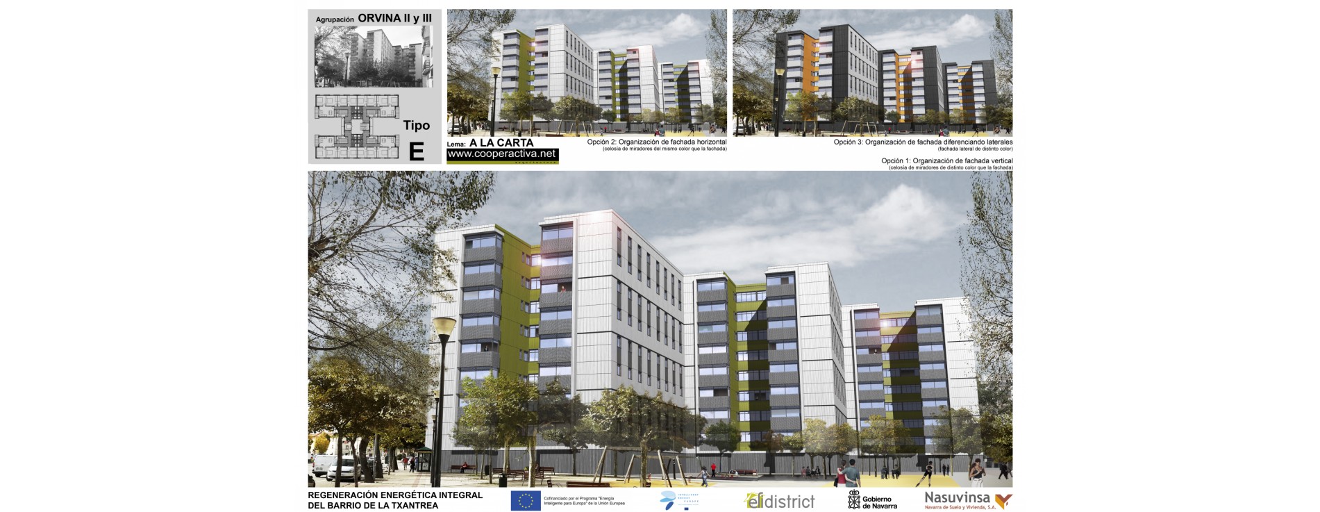 caracteristicas: 1º Premio en la categoria de fachada ventilada en el concurso para la rehabilitación energetica integral de las agrupaciones de bloques de viviendas, Orvina II y III, del barrio de la Txantrea en Pamplona